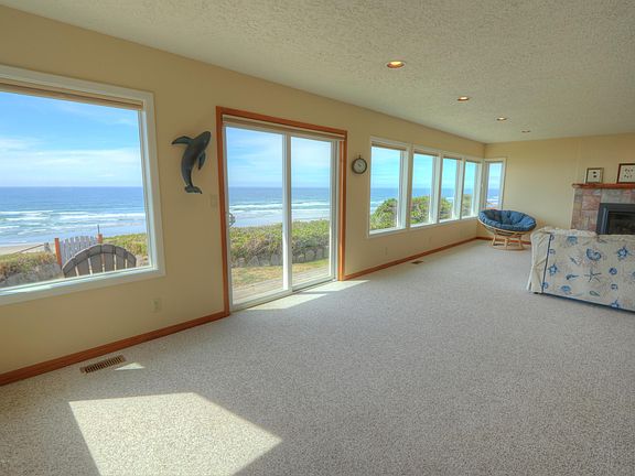 Breathtaking Panoramic Views from this Ocean Front single level home! This stunning residence is nestled at the end of a private drive with extra space to park a boat, motor home, or guest parking. As you step inside you will immediately be in awe of the expansive views of the ocean from the Light House to the South Jetty. The open floor plan is perfect for entertaining, and the adjoining large den is a great family room, or would make a great office or movie watching room. Wake up to the sight, sounds and smell of the ocean from the Master Bedroom then take a stroll to the beach just steps from your back door, down a private and secured gentle beach walkway. You will also find yourself whale watching from a perfect vantage point or taking a short walk to the Bay Front or
