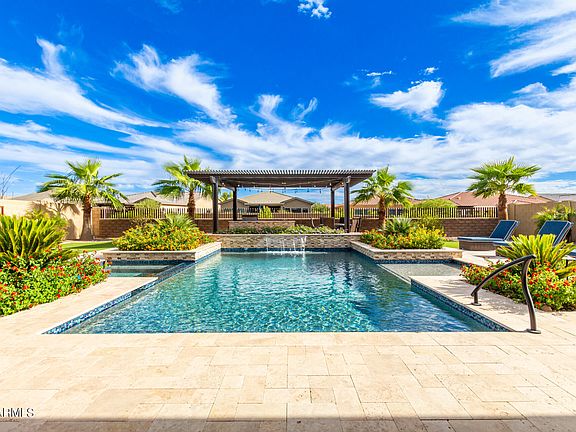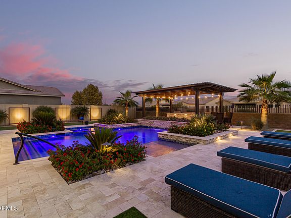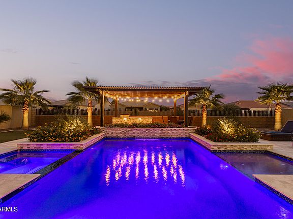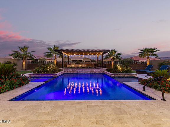 What's better than staying at the Ritz? Living in this stunning home! You'll have the best backyard in the valley, truly Arizona resort living! This home offers a lovely stone facade, a manicured landscape, & a 3-car garage. This estate has a welcoming foyer that opens to the perfectly sized living room with built-in desk & cabinets. You'll love the bright and airy great room adorned with attractive wood beams, a warm fireplace, & sliding glass doors to the back, merging the indoor & outdoor activities. Cooking is a delight in this gorgeous kitchen boasting staggered cabinets, tile backsplash, granite counters, SS appliances, a walk-in pantry, and an island w/a breakfast bar. The well-sized owner's suite showcases an immaculate ensuite w/dual vanities, a separate tub, & a walk-in shower. The secondary bedrooms are all provided with private bathrooms for added convenience. Through the sliding glass doors of the living room, you'll find an inviting covered patio w/an outdoor fireplace, a sparkling blue pool, a grassy landscape, & a pergola w/a BBQ grill, perfect for al fresco dining. This gem won't disappoint you!