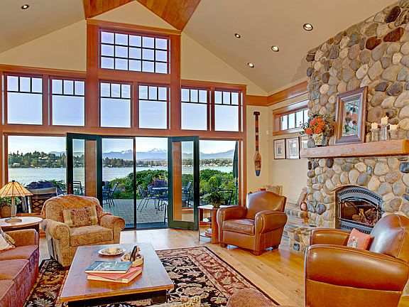 Sweeping 220 degree Lake & Mountain views from an unparalleled vantage point of Lake Stevens. Custom-built masterpiece Lodge-Style home nestled on 75 ft of lakefront. Thoughtfully designed w/comfort & entertaining in mind. Artfully crafted w/ attention to detail. Grand spaces w/ soaring ceilings & open great-room, accented w/ Lodge pine poles. Each room is view oriented. Huge kitchen. Clear fir millwork. 3 Bedroom Suites. 4 FRPL. Expansive patio w/outdoor frpl. Sound system. 3 Car Garage.