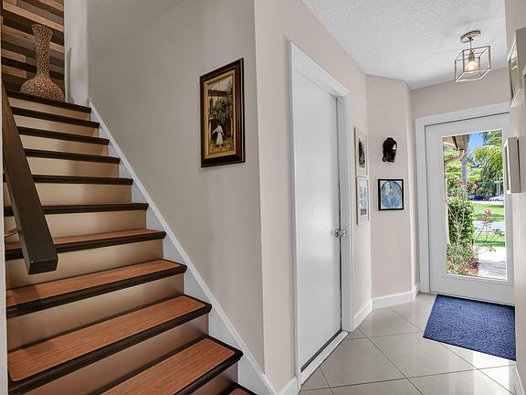 Stunning 2/2 lakefront townhome nestled in the highly sought-after Woodstream neighborhood within the Lakes of Boca Raton. Recently renovated, this home welcomes you with an abundance of natural light streaming through its windows, complemented by lofty ceilings that enhance the feeling of spaciousness. Enhanced with impact windows and a new roof installed just 4 years ago, this home ensures both security and longevity. Inside you'll find a seamless blend of porcelain and laminate flooring throughout, adding a touch of modern elegance to every room. Upstairs, the generously sized primary bedroom features a walk-in closet and an updated ensuite bathroom, providing a peaceful retreat with complete privacy. Downstairs, the living area greets you with serene lake views, which open up to a covered patio, perfect for enjoying the scenery in comfort or entertaining guests.