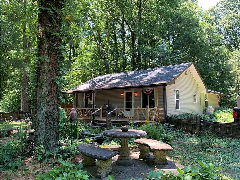 Back on the market due to no fault of the seller!!This is a one of a kind home situated on 3 Lot's.The front yard welcomes you with lush landscaping and a low fenced front yd with character galore. It has a coi pond, concrete table and chairs and the best part you ask? The large covered front porch. Inside you'll find a festive vacation setting that just screams fun but can also be used as a tranquil sanctuary. There are 2 BR's on the main level and downstairs is a large space that has been used as the primary bedroom and Bath and laundry. You'll be able to watch wildlife from your bed or step outside to listen to the birds. Upstairs offers the living rm and sun room and a bath room you won't forget.