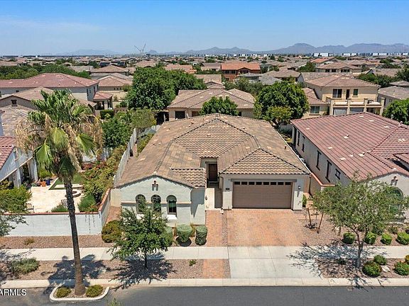 Charming home in the award-winning Eastmark community! This 3-bed, 2-bath residence includes a private bonus room that could be a 4th bedroom plus an office/den area. The stunning kitchen features classic navy cabinetry, granite counters, stainless steel appliances w/ gas cooktop & hood vent, double ovens, large island w/ pendant lights & custom wall decor. The kitchen opens to a spacious family dining & great room w/ oversized sliding door that lets in abundant natural light. The split floor plan includes a large primary suite w/ a barn door leading to the ensuite. Double vanities, tiled walk-in shower & closet. The laundry room connects to the master closet for convenience. The backyard boasts an extended covered patio, pergola, gas firepit, synthetic grass for low maintenance & ... a storage shed. Garage has 220 outlet for EV charging possibility! Community amenities include a pool, parks, garden, dining, lakes, workout facility & more! Close to freeways, shopping, dining, & excellent schools!
