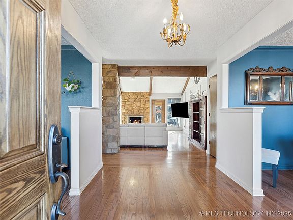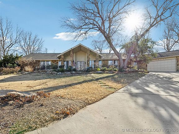Tucked into a beautiful South Tulsa neighborhood with mature trees, this lovely home, sprawled out on half an acre, is nestled into a cul-de-sac. With nearly 3000 sq ft all on one level, this home has 4 bedrooms, 3 full bathrooms and tons of living space. A vast covered porch surrounded with stone pillars and rock landscape, ushers you in through double doors and large windows. Welcomed into the home, there's an office/study on one side and a formal dining room on the other. Wood floors spill into the living room with vaulted ceilings, stone pillars and fireplace, plus wood beams & paneled walls creating a warm, elegant feel. Large windows look out over the beautiful yard & patio. Galley kitchen has granite and tumbled travertine backsplash, copper sink plus double oven, built in microwave & dishwasher. Breakfast nook off kitchen looks into the large private yard. Off primary suite is access to backyard plus private full bathroom. Two more full baths plus a family room/game room area with built in cabinetry and a large utility room complete this amazing home. Oversized stone patio off back of the home surrounded by layers of yard and stone retaining wall for coziness and privacy. Garage opens to the backyard as well for easy access to tools and toys! 4th bedroom, bathroom and game room could also be a great mother-in-law suite. Close to dining, highway access and more, all within exemplary Jenks School District.