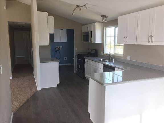 This cute home has NEW windows in the remodeled kitchen, dining room, living room, and both spacious bedrooms. The kitchen has NEW cabinets, granite counter tops, dishwasher, stove and microwave. Both bedrooms and living room have NEW carpet, and paint. The master bedroom has its own master bathroom. The house has a NEW roof. The exterior of this adorable home has a fresh coat of paint. The property has 2 porches, both with nice views. A very nice home with 2.33 acres of land ( 101,494 square feet ) located in Pinon Hills. The home itself has 1,152 square feet. A NEW septic tank was installed.