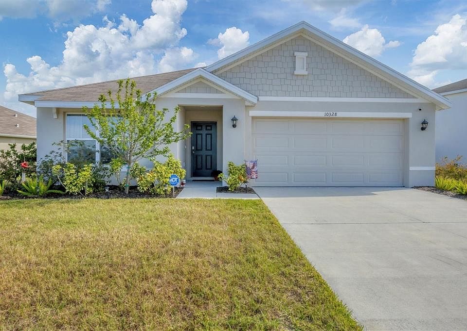 Don't wait for a new build. Seller is offering a ONE YEAR home warranty! This tastefully designed three-bedroom, two-bath home is move in-ready. Step inside the tile foyer and notice the split floor plan designed for privacy. The kitchen/living/dining room combo makes it the perfect place to entertain. This kitchen boasts stainless steel appliances, an oversized sink, contemporary gray cabinetry and stone countertops. Enjoy the cool Florida winters sitting on the screened lanai while taking in the scenic lake and fountain view. Retreat to the large primary with en-suite bath and walk-in closet. This home has upgraded features like a charming front elevation, glass shower doors, fenced yard, quiet-close garage door, and is within a short walking distance to the pool and all the community amenities. Book your appointment today!