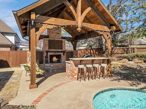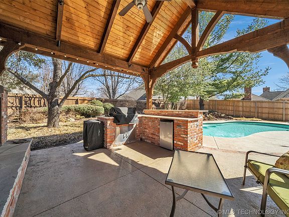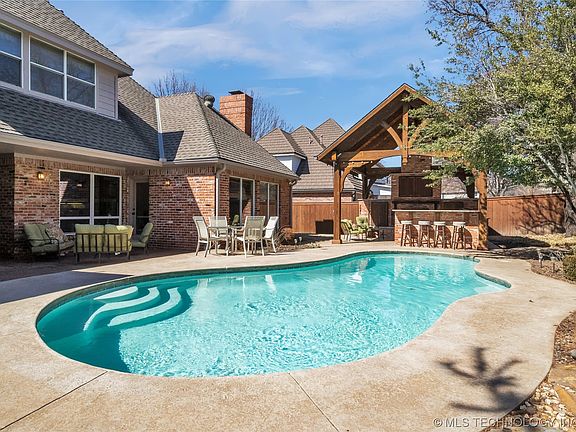 Fabulous home in award winning Jenks Southeast elementary school. 4 beds /3 bath home. Office downstairs can be a flex 5th bedroom, one of the upstairs bedrooms can be a large game room. Magazine worthy backyard with professional lighting, landscaping, in ground pool with waterfall, stamped & sealed concrete pool deck, outdoor kitchen, fireplace, cabana with built in entertainment center with TV. Rich hardwood floors. All new carpet. Sellers added a kitchen pantry, new large walk-in closet to upstairs bedroom/game room along with canned lights. New Gutter covers, New wireless Nest thermostats. New windows installed in Master bedroom and bathroom. Added a stone pathway from gate to cabana and replaced all door hardware. AC unit 2 years old, Hot water heater approx. 5 years old. Many more upgrades in this house!