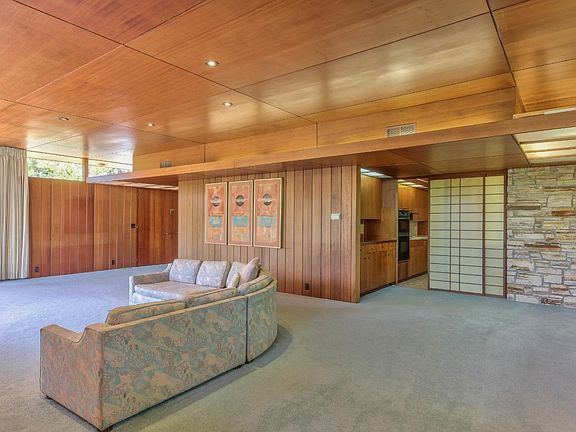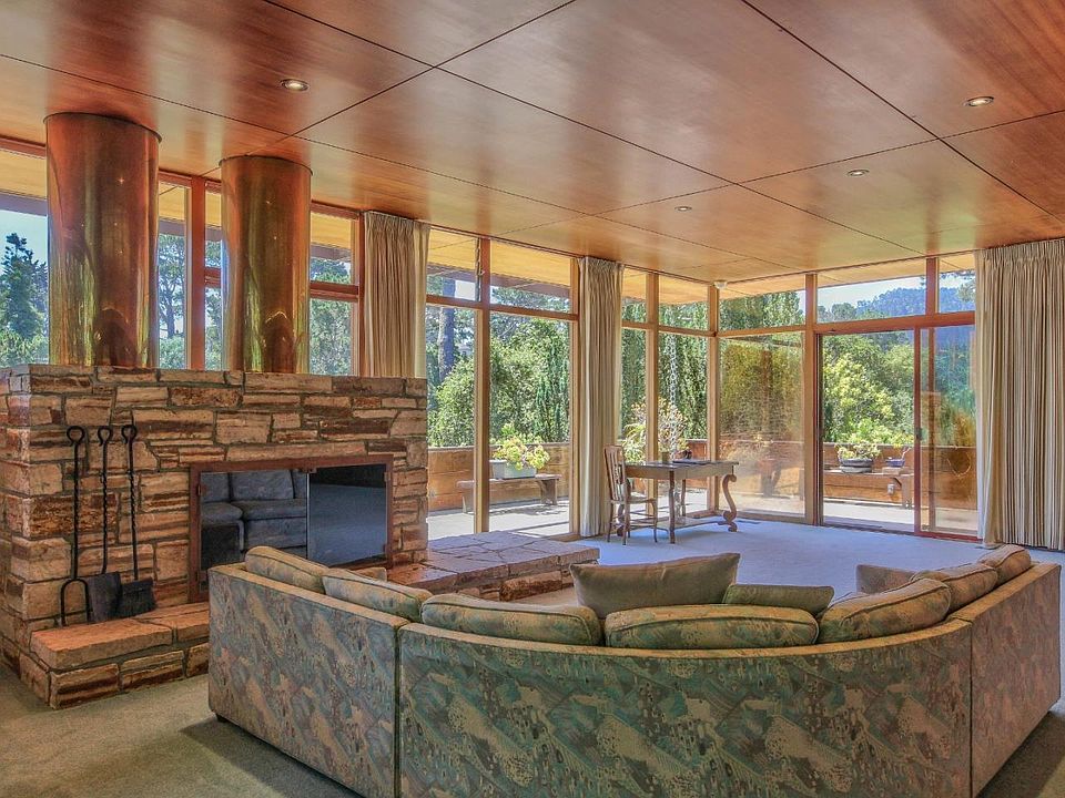 This timeless mid-century modern home in the Peters Gate area of Monterey has walls of windows and doors that create a flow between indoor and outdoor spaces. Enter through the striking front doors to an entry that flows into the large living room with stunning stone fireplace as its focal point. This room offers spaces for conversation in front of the fire, dining, a piano or reading area. Kitchen and Master bedroom and bath are on this level. Various skylights bring light to the beautiful redwood walls throughout the house. Down the stairs is another spacious room with fireplace, its own entry and a separate outdoor deck. This large space with kitchenette and bathroom could be enjoyed as it is or divided to create separate bedrooms. Lush landscaping creates a private environment for this property. The neighborhood is a gem of Monterey and the house is walking distance to downtown shops, restaurants and the vibrant and historical Monterey Bay.