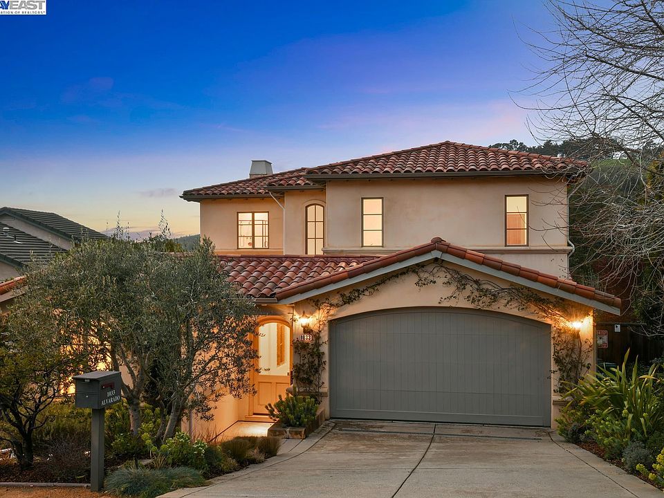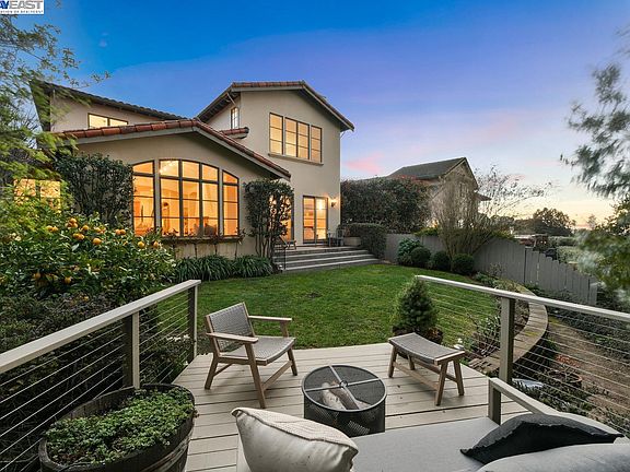 This expansive 4BD/3.5BA 3,577 sq ft Spanish Contemporary home offers arched passageways, prominent radius windows, sunlit rooms, lofty ceilings, red clay roof, intricate iron railings, hardwood floors, and a perfect “al fresco” courtyard. Off of the level-in entry is a first floor ensuite bedroom, with a large closet and full bath including a shower-over-tub – ideal for in-laws or a live-in au pair. The kitchen features a Thermador 6-burner gas range, Bosch dual ovens/dishwasher, and a massive chef’s island with stainless-steel sink. The kitchen/family room open floor plan is steps away from the sun washed dining/living room. French doors lead to the level yard which includes a terrace balcony overlooking the Claremont Hills. A powder room is located at the foot of the elegant stairway that leads to a mezzanine balcony and 3 sun-filled bedrooms, including the primary suite with views of the Golden Gate Bridge, walk-in closets, and a small ante chamber. The primary bath contains a sunken tub, walk-in shower, toilet closet, and dual sinks. The home also features 3 gas fireplaces, a full laundry room, 2 car garage, rear yard with verdant lawn and a cliff terrace balcony. The home is near top-rated schools, parks, and shops/restaurants on Ashby Avenue and the Elmwood neighborhood.