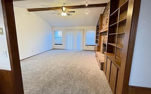 Freshly painted, new carpet, new ceiling fans, new lights, new blinds, new shower, new faucets, large high ceiling living room with a fireplace, garage, convenient location and a great quiet neighborhood 12 month lease, resident pays for all utilities, cats and small dogs welcome.