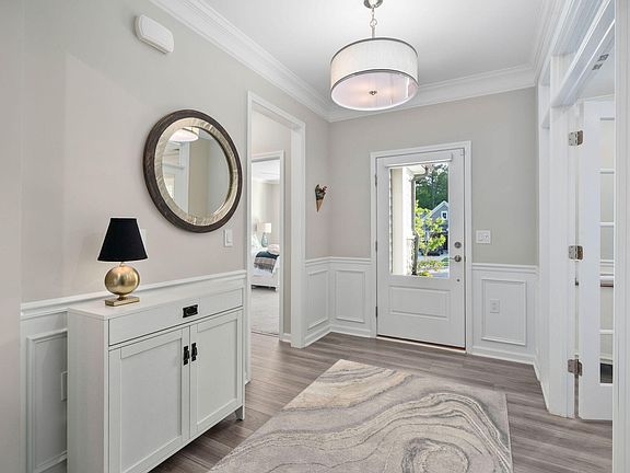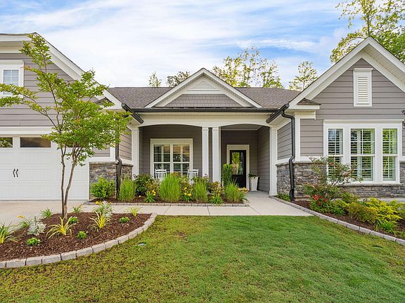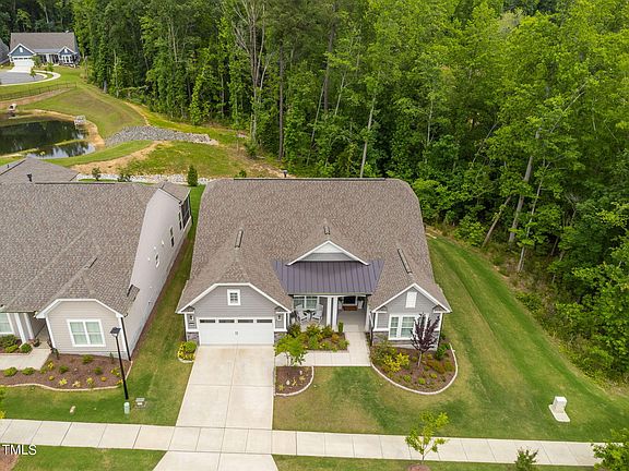 Absolutely stunning! This gorgeous Dunwoody Plan, a two-story home in the highly sought-after Del Webb at Traditions, a 55+ community. This spacious home is on a premium lot that backs to woods, hard to find! Featuring 3 bedrooms, 3 ½ baths, an office, gourmet kitchen, extended dining room and screened porch. The first floor has the primary bedroom and large bathroom retreat with walk in tile shower, vanity, and custom closets. The guest suite has it's own bathroom, perfect for visitors. The chefs kitchen is equipped with a gas cooktop, modern sleek hood, double wall ovens, a walk-in pantry, and a large quartz island. The family room, complete with a cozy fireplace, is perfect for gatherings. Custom lighting, drapes/window coverings throughout the home adds an elegant touch, while luxury vinyl plank flooring spans the main living areas. Upstairs, you'll find a large bonus room, bedroom, full bath, walk-in attic storage and conditioned storage. Custom garage with built in cabinets and epoxy floors. Enjoy the sunrise and wooded views from the private fenced yard, which is perfect for relaxing. With extensive landscaping, custom bluestone patio and screened porch you'll feel like you're on vacation. Don't miss out on this incredible home where luxury meets comfort in a serene, picturesque setting. Enjoy the amenities with a clubhouse, indoor pool, fitness center, tennis, pickleball and many clubs and activities. Close to shopping and restaurants and downtown Wake Forest