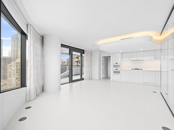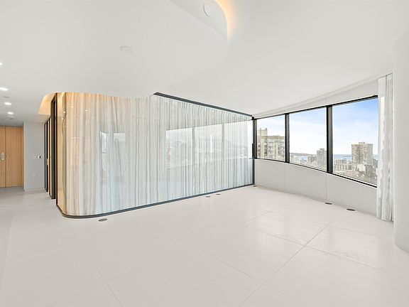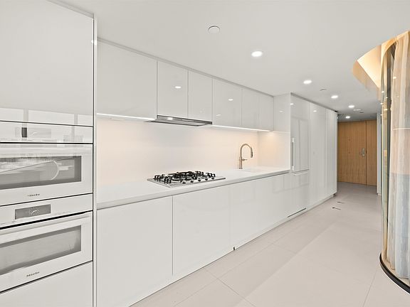 Floor-to-ceiling windowsCurved glass wallsLarge white porcelain flooringItalian-designed kitchenMiele appliances