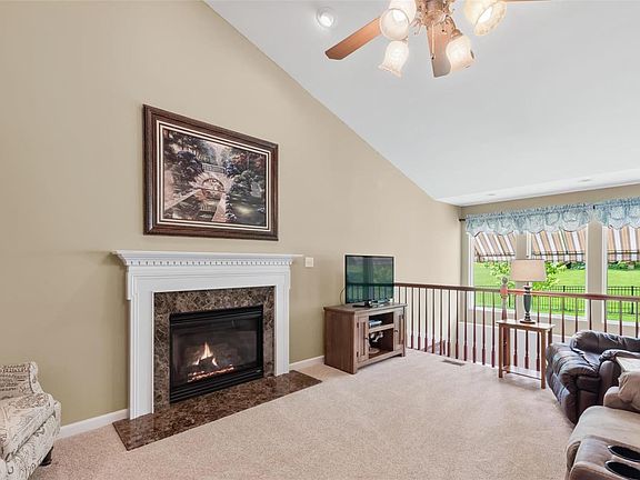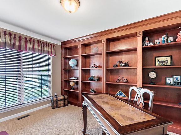 Beautiful split bedroom floor plan with over 2900+ sq ft of finished living space. It all starts with gorgeous landscaping. Upon entering you will be welcomed by gracious entry, a formal dining room with large bay window & the in home office with b/i bookcases & accented with crown molding. Great room is the center of entertaining & relaxing with gas f/p, atrium windows with remote blinds & newer carpeting. Chefs delight kitchen offers granite counters, s/s appliances, espresso 42" cab & spacious breakfast room which opens to covered patio overlooking fenced backyard. Master suite-the perfect place to unwind with triple bay window, large w/i closet, master bath includes dual sinks plus sep whirlpool tub & shower. The other two bedrooms are good size and share a full bath. Main floor laundry. Deep pour finished lower level with family room, den or craft area, 4th bed with egress, two large w/i closets and a full bath-plus still plenty of storage. Sprinkler system. Former Display. WOW.