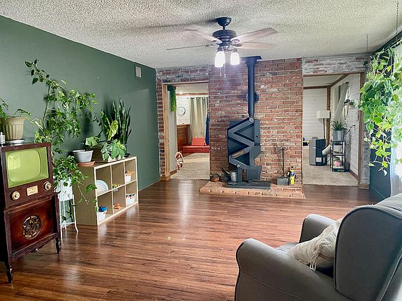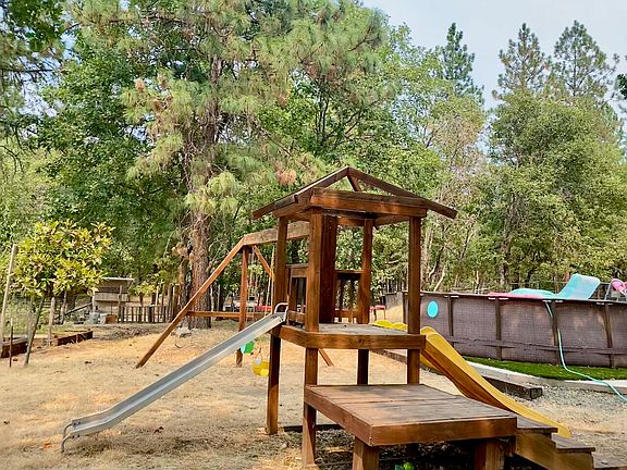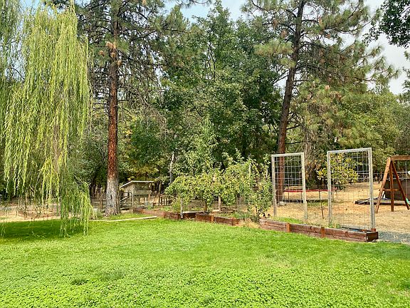 Enjoy life in the country on this spacious 1+ acre property with wonderful single level ranch style home! The home has been remodeled and freshly painted inside with a creative flare. The property has so much to offer with detached garage, separate storage building, fenced garden, raised garden beds, fruit trees, chicken coop, wonderful play structure, trampoline and above ground pool. The 3 bedroom 2 bath home has French doors leading from the primary bedroom to a deck that wraps around and leads to the bright kitchen. The ensuite primary bedroom has a wonderful soaking tub and custom tile. A handy laundry room off the kitchen, large family room, and living room with a pellet stove that works without electricity, make this an ideal country home! Conveniently located in the North Valley near the town of Merlin, close to schools and shopping. Qualified buyer may assume current loan at 5.25%.