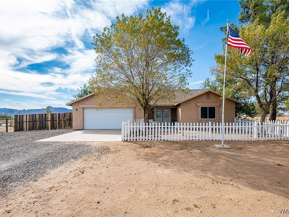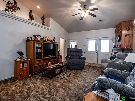 Lovely 4 bedroom 2 bath home situated on 1 acre partially fenced lot. This property has an attached 2 car garage as well as a detached 1 car garage that has evaporative cooling and insulation. Home is plumbed or propane, but currently all electric. Features include *Front french doors that fully open *Huge sliding back door is fully insulated *Indoor laundry *Carpet and tile throughout *Energy Star Appliances *Casual dining area *Vaulted ceilings *Dual sinks in master bath *Windows equipped with security screens *Pellet stove *Gazebo with custom swings and table *Covered back patio *Covered RV parking *Mature trees *3 watering systems Just 30 minutes to Kingman area, or Bullhead City/Laughlin and the Colorado River