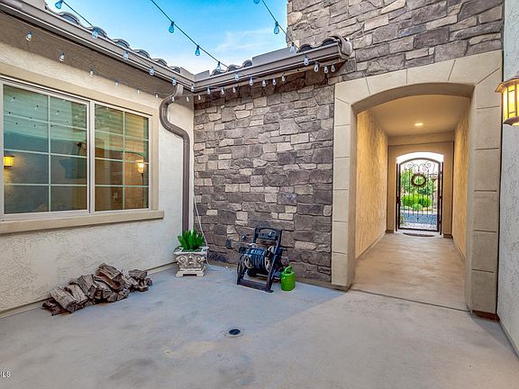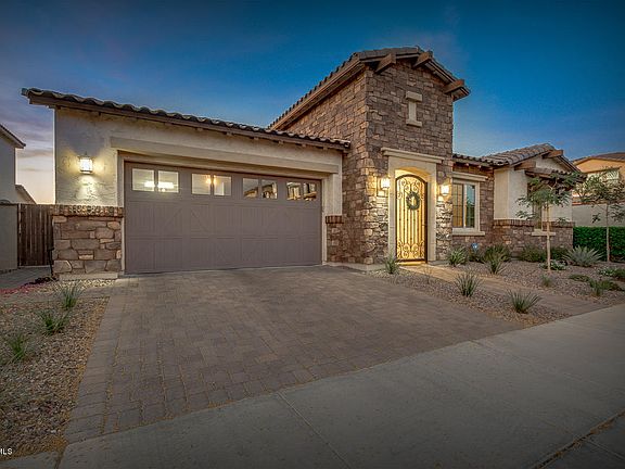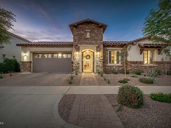 Amazing Santa Barbara style home in Eastmark on oversized lot! Enter through the custom iron gate to find an inviting portico & courtyard ideal for privacy. Exquisite interior featuring gas fireplace in great room, custom wall in formal dining room, private office w/french doors, 4 bed, 3 bath, & spacious game room. Chef's kitchen showcases granite counters, island w/breakfast bar, plethora of upgraded cabinets, SS appliances & walk-in pantry. Fall in love with the master suite including a lavish bath with his & her sinks, separate tub/shower & walk-in closet. Entertain your guests in the backyard with it's 800+ SqFt gas & electric heated pebble tec saltwater pool that includes a Chiller, Swim Jet, Spa w/4 water features, gas fire pit, built-in Traeger BBQ & grassy area w/sunken trampoline Other Features IncludeHighly desired 10' ceilings throughout with 8' doorways.Crown Molding and Wainscoting in all the right places.The laundry room is upgraded with extra counter top space, cabinets, and utility sink.Three car tandem garage is set up perfect for a workshop with the counter tops, cabinets, and separate exit door to side yard.Backyard FeaturesBoth Gas & Electric Heated + Chiller Pool and Spa with in-ground cleaning system that can easily be controlled from your smartphone.Backyard and Pool was added less than 6 months ago, basically brand new! Waterfalls and bubbler on the oversized Baja step are LED lit.Large travertine tile with artificial turf throughout the backyard.Gas fire pit features reclaimed brick from Los Angeles.About EastmarkEastmark features amazing parks, walking paths, splash pads, heated pool, climbing structure, lake, community center full of games and entertainment. Eastmark also has its very own farm (Steadfast Farm).Local School InfoElementary: Gateway Polytechnic, Silver Valley, Sequoia & Basis. Middle schools: Eastmark High, Queen Creek, Basis.High schools: Eastmark high, Queen Creek High, & Basis. Other Features IncludeHighly desired 10' ceilings throughout with 8' doorways.Crown Molding and Wainscoting in all the right places.The laundry room is upgraded with extra counter top space, cabinets, and utility sink.Three car tandem garage is set up perfect for a workshop with the counter tops, cabinets, and separate exit door to side yard.Backyard FeaturesBoth Gas & Electric Heated + Chiller Pool and Spa with in-ground cleaning system that can easily be controlled from your smartphone.Backyard and Pool was added less than 6 months ago, basically brand new! Waterfalls and bubbler on the oversized Baja step are LED lit.Large travertine tile with artificial turf throughout the backyard.Gas fire pit features reclaimed brick from Los Angeles.About EastmarkEastmark features amazing parks, walking paths, splash pads, heated pool, climbing structure, lake, community center full of games and entertainment. Eastmark also has its very own farm (Steadfast Farm).Local School InfoElementary: Gateway Polytechnic, Silver Valley, Sequoia & Basis. Middle schools: Eastmark High, Queen Creek, Basis.High schools: Eastmark high, Queen Creek High, & Basis.