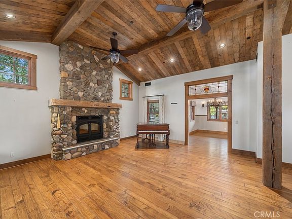 Inside, soaring wood beam cathedral ceilings, quarter sewn white oak flooring, rich wood-trimmed windows, and a floor-to-ceiling stone fireplace anchors the expansive great room. Recessed lighting, ceiling fans, and timeless finishes create a warm, inviting atmosphere.