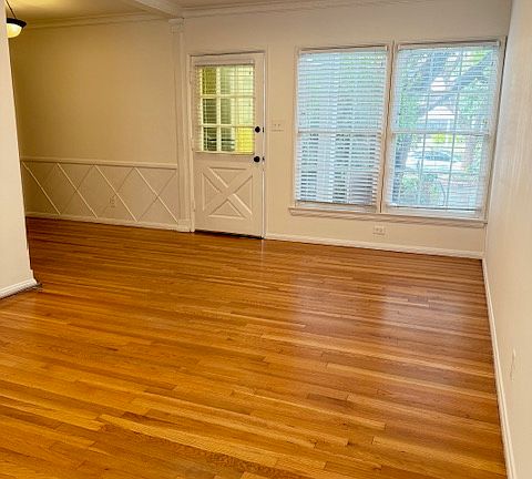 Separate tub and showerCrown mouldingDining area with wainscotingHardwood floorsGood closetsOriginal tile in bathroom