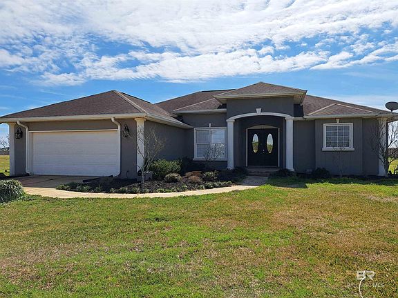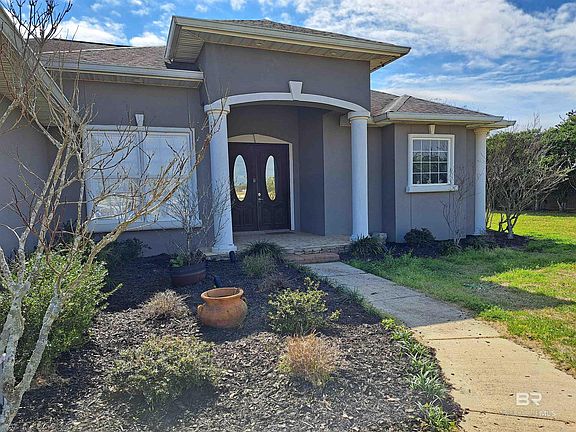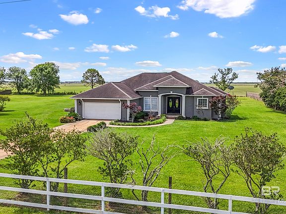 Seeking a home in a peaceful location, yet close to the beach, shopping, entertainment, and great dining? You have found it! Gulf Shores with its' sugar white beaches is less than 10 miles away. This custom built home on two level acres and no HOA is waiting for you. The entire 2 acres has been fenced in and has no restrictions on pets/animals. Enjoy the tranquility of sunrises and sets from the large covered patio overlooking the large backyard and farmland beyond! There is a sizable breakfast room with nice views of the backyard. Additionally, there is a formal dining room which could be used as an office in the front of the home overlooking the landscaped front yard. The entire home has high ceilings throughout. The spacious primary bedroom has access to the large covered patio in the back. Attached is a large en-suite with a contemporary flair and wood accents. The en-suite has a separate water closet, large walk-in shower, double vanities, and large soaking tub. The kitchen is light and bright with plenty of counter space. There are two pantries and white cabinetry. Laundry room is in-between the kitchen and 2-car garage. A sink and additional shelving has recently been added to the garage. The large out building/barn is equipped with electricity and is sectioned off in 3 sections to meet ones' needs. This home is a must see for anyone wanting some breathing room or a small farm yet convenient to amenities. Information is deemed to be accurate, but not guaranteed. Buyer & buyer agent to confirm all information they deem pertinent during contingency period. Buyer to verify all information during due diligence.