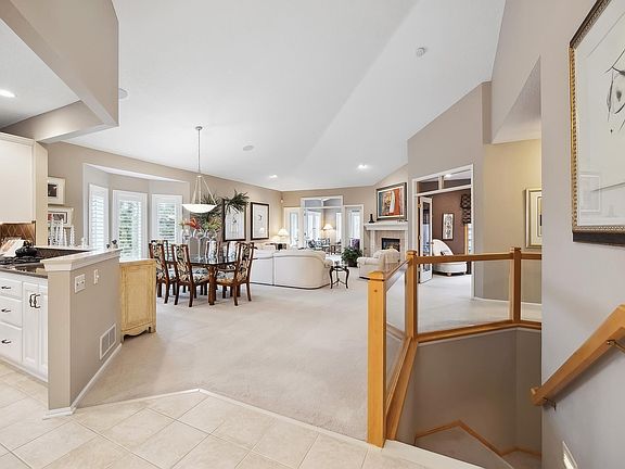 This remarkable home greets you with soaring vaulted ceilings, plush carpeting, and an inviting living room complete with a cozy gas-burning fireplace. Adjacent to the living area, you'll find a bright sunroom, each space thoughtfully maintained and exquisitely decorated. The kitchen shines with its white cabinetry offering ample storage, sleek quartz countertops, decorative back splash, under cabinet lighting and a charming informal dining area.