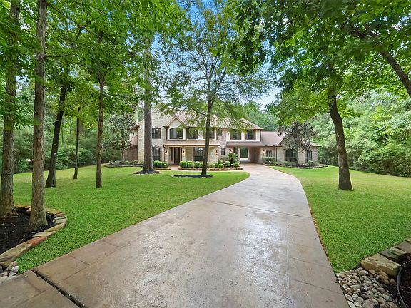 Gorgeous renovation that feels like new on a lush forested acre of privacy. Surrounded by beautiful majestic trees. Within a gated enclave of upscale acreage estates where trees are protected. Tall windows showcase the extraordinary views. Ultra spacious plan designed for extravagant living & the happy expectation of entertaining. Quartz counters. Wood floors. Large form tile. Luxe Primary offers a soaking tub, large shower & dual closets. Flex Sunroom on the 1st Floor. New outdoor kitchen: gas grill/burners. Gameroom up with refreshment bar. All large bedrooms with walk-in closets +Guest Suite. Unique design lets you unload groceries/passengers under a Porte Cochere. Huge 5-Car Motor/Sports Ct w/back entry Garage. Relax in the quiet solitude; no visible back neighbors. 20 ft of natural forest is retained on the sides & back of lots for 40 ft of privacy between neighbors. 2 Fishing Lakes*Paved Trails*Playground*Park. 1.6 miles to I-45 dining/shopping. The Woodlands 15 min.