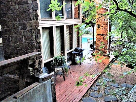 MAJOR PRICE REDUCTION! This beautiful rock & cedar home is on a private wooded 2 acre tract. Soaring ceilings in the living room with a double faced rock fireplace and windowed walls make this home truly one of a kind. There are 3 bedrooms and an office, 2.5 baths and a gorgeous sunroom. The kitchen has updated appliances and granite counters. This is a multilevel home with a loft over the master bedroom and a private deck off the master bath. A large covered patio in back overlooks a 15 x 30 concrete pool and is a great place to relax & enjoy the outdoors. There is a half bath with direct access from the deck. A rock waterfall and pond next to the pool add to the relaxing atmosphere. The wooded tract goes back to a canyon and has multiple trails to explore. A gravel circle drive provides the entrance to this home. It cannot be seen from the road. So if you like privacy, this is one you'll want to see! Call today for your appointment.