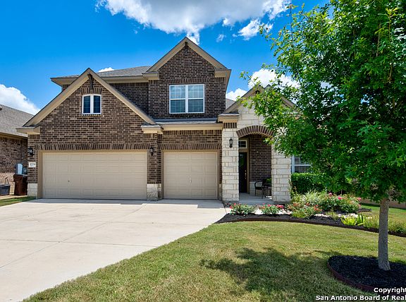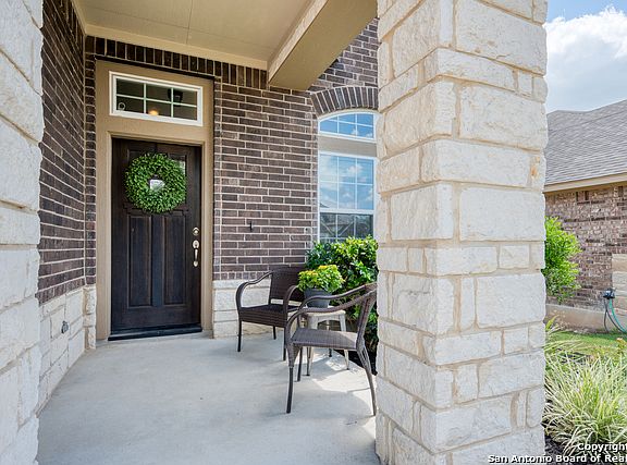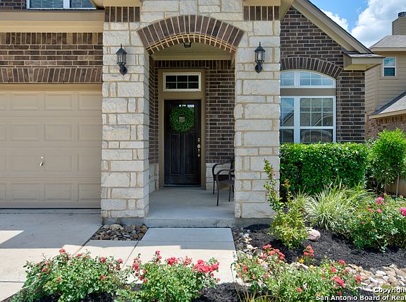 Stunning two-story, immaculate David Weekley home in the gated subdivision of Triana. This gorgeous home shows like a model home with its custom drapes, wood blinds, elegant flooring and extensive upgrades throughout. The owners spared no expense in designing this gourmet kitchen with a massive granite island with a full wall subway tile backsplash, 42" glass front cabinets, professional GE monogram hood and professional dual gas/electric GE monogram range, USB outlets and under mount lighting. From the moment you step into this showcase home, explore the open concept living with the spacious living room, gorgeous kitchen, elegant dining room including crown molding, chair rail and designer chandelier. High ceilings, wood flooring, ceramic tile and surround sound in the living room are just a few of the extras. Enjoy the breathtaking views through the serene backyard bay windows surrounded by a very private extended patio, greenbelt with mature trees, personal firepit arena, partial xeroscapped yard, decorative rock and sprinkler system in the front and backyard. This inviting floorplan includes a downstairs master's retreat and master bath with double vanities, garden tub, separate tiled shower with marble counters, under mount sinks, custom mirrors and a huge master closet with additional shelving. The lovely staircase leads you into a separate living area perfect for a game room with three bedrooms including walk-in closets and two bathrooms with upgraded granite counters. Triana is an exceptional neighborhood with a private pool, playground and pavillion. The neighborhood is walking distance to the elementary school and the Social Committee hosts neighborhood gatherings and food truck nights. Enjoy the comforts of the small town feel of Helotes yet minutes away from 1604, IH10, 151, La Cantera, Fiesta Texas and top-rated NISD schools. This home is a must see!