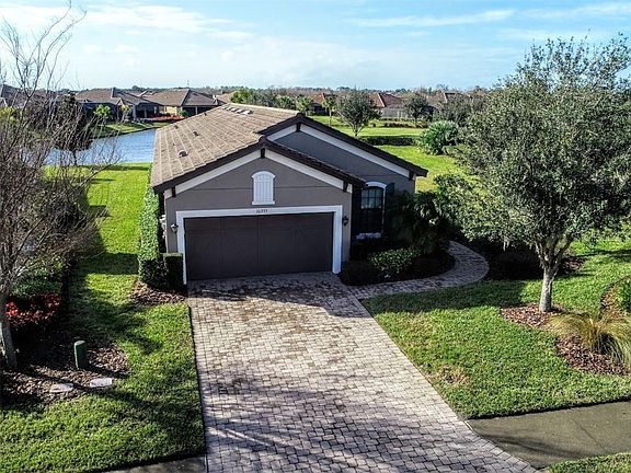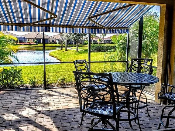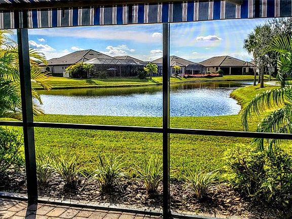 Water View Home located at "Esplanade at Artisan Lakes". This move in ready, 3 bedroom PLUS den, 2 bath, 2 car garage home is situated on an oversized corner lot which has an abundance of privacy. It has fresh exterior paint and offers 1939 square of feet living area. The luxurious Amenity Center with Resort Style Pool, Spa and Fitness Center will make you feel like you are on vacation every day of the year. Cable, Internet and Lawn Care which includes mowing, trimming, fertilizing and irrigation are included! Long water views and South West sunsets from the covered and extended lanai create a tranquil setting where you can entertain, grill or simply relax. A retractable, remote control awning provides extra shade making this a comfortable year-round living space. This area is fully screened and is pre-plumbed with natural gas, drain and water lines so an outdoor kitchen can be added. The open floor plan contains a Great Room, Kitchen with Breakfast Bar and Formal Dining area. The large well-appointed kitchen offers extensive counter space and stainless steel appliances including a natural gas range and cooktop. There are numerous 42' upper crowned cabinets with under cabinet lighting and a generous pantry. This home has elegant upgrades such as Tray Ceilings with Crown Molding in the Master Bedroom, Great Room, Dining Room and Den. There are upgraded 8' doors throughout including French Doors in the Den and pocket doors in the Bathrooms. The luxurious Owner's Suite features large windows with water views and an expansive walk-in closet. The Master Bath offers a private water closet, large vanity area with dual sinks, a large shower with shampoo niche, corner seat and decorative tile. The spacious Laundry Room offers a functional layout with a large sink, storage cabinets and Washer and Dryer that convey to buyer. The beautifully landscaped neighborhood has 24 hour security at the gated entrance and Walking Trails. The 7000 sf Amenity Center features 24-hr. Fitness Center, Tennis and Pickle Ball Courts, Bocce Ball, Billiard/Card Room, Club/Craft Room, Common Room with large TV, Movement Studio, Treatment Room plus Indoor and Outdoor Kitchens. The Club House is situated on nearly 6 acres of property and offers a Resort-Style Heated Pool with lap lanes, Resistance Pool, and a Spa. A Lifestyle Director will be on hand to interact with residents and coordinate Special Activities and Events. There are also two Dog Parks, a Fire Pit, Formal Events Lawn, and numerous clubs. Conveniently located with St. Pete just over the Skyway where you will find Stunning Beaches, the New Downtown Pier, Museums, Many Restaurants and Ft Desoto Park. In addition many amenities can be found in Bradenton, Sarasota, Lakewood Ranch including Theaters, numerous Shopping Malls and Public Golf Clubs. A brand new Publix is just down the road. Come experience the luxurious lifestyle this property can offer. This is Resort Style Living at its best!