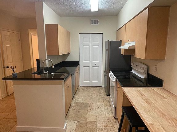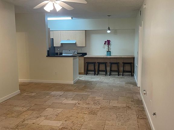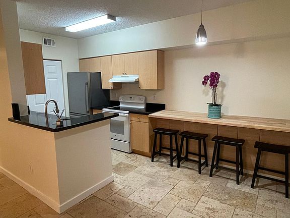 Tucked away in a private part of the community you will enjoy your privacy in this quiet ground floor unit. Newer refrigerator. Newer AC. Granite countertops. 4 person breakfast bar with butchers block top. Large closets. Travertine stone tile throughout. Remote controlled fans and lights in living room and bedrooms. Private location. This community has a pool and a gym and is walking distance of shopping and restaurants. Renter pays for utilities