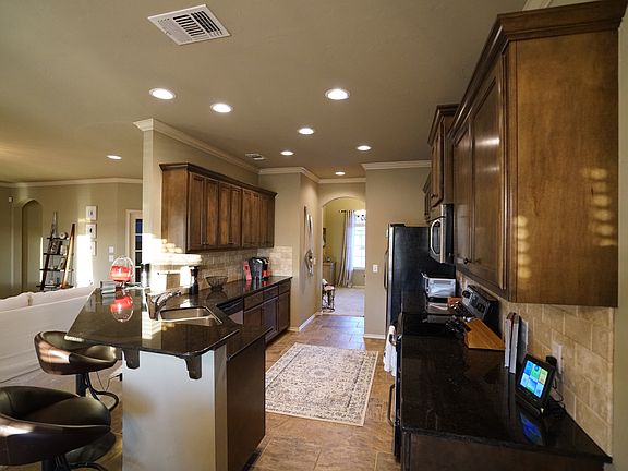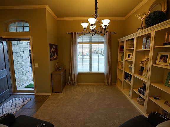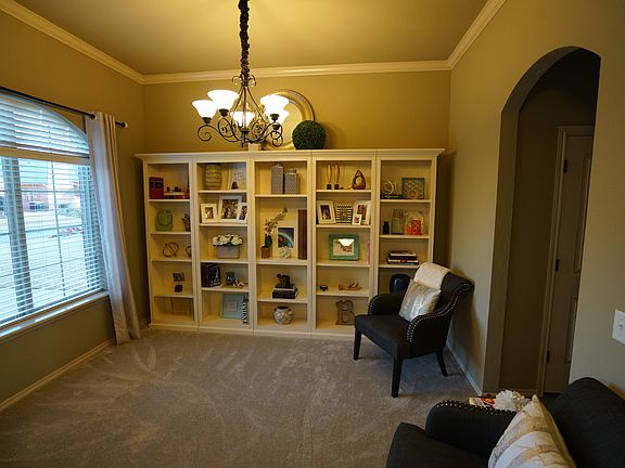This 2108 sq. ft. garden home is a one-owner property that features three bedrooms, two full bathrooms, dining, and two living areas with the option to have one bedroom function as a study with French doors. The home is an open-concept floor plan with granite in the kitchen and both baths. Amenities include sprinkler system, stainless steel appliances in the kitchen, gas burning fire-place in the living room, and a storm shelter in the 2-car garage. Enjoy the greenbelt view from the covered patio on this large corner lot - HOA dues cover lawn and greenbelt maintenance.