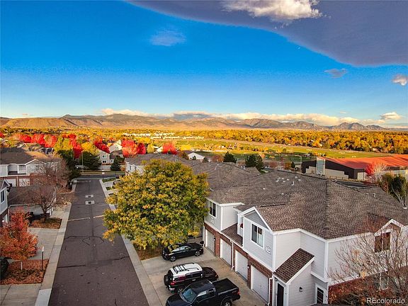 Welcome to this BEAUTIFUL AND WELL-MAINTAINED 2 bedroom, 2 bathroom Condo in the desirable Skyline Estates Community. Stunning views of our Colorado mountains including the summit of Longs Peak. Walking distance to Apex Field House and Stenger Soccer Complex. Surrounded by LUSH TREES, professional landscaping and maintained sidewalks connecting you to bike paths to take long walks or bike rides enjoying nature. Private entrance from the garage into your foyer, then up one flight of stairs to take in the beauty of your home. This home features an open floor plan with new luxury vinyl plank flooring throughout and an abundance of natural light. The open kitchen has 42” cabinets, granite counters and some stainless appliances. The dining area leads out to the private balcony.The spacious primary bedroom features an ensuite full bath with double vanity and walk-in closet. Second bedroom is adjacent to another full bath. Convenient laundry that fits a full-size washer and dryer. Enjoy the heated community pool, a re-coated hot-tub and a community playground just a short walk away. Water, sewer, trash, snow removal are included in your HOA fee along with landscaping maintenance and exterior structure insurance. AMAZING ARVADA LOCATION with convenient access to shopping, parks, Arvada light-rail station, Red Rocks Community College - all within walking distance. Olde Town Arvada just a short drive or fun bike ride away. Easy access to I-70. Watch the City of Arvada FIREWORKS from your balcony next 4th of July when you make this beautiful condo your home!