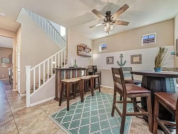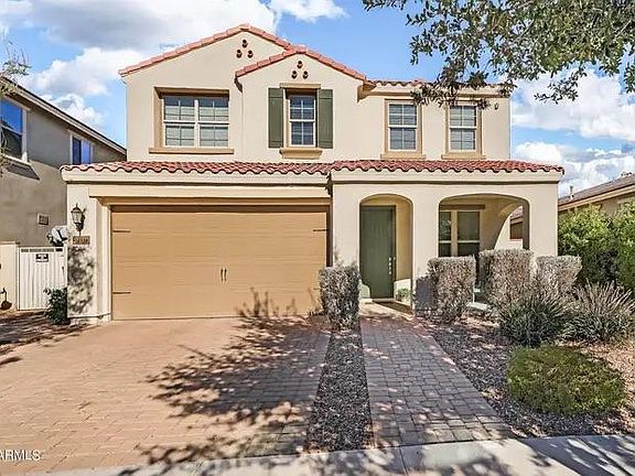 Beautiful 3 bedroom and 2.5 bathroom home located in the Eastmark Community! Step into the home and you will see tile throughout the traffic areas with carpet in the bedrooms. Gourmet Kitchen features a stone tile backsplash, granite countertops, stainless steel appliances, walk-In pantry and a large kitchen island. Primary bedroom boasts a separate walk-In shower, garden tub, dual sinks and a walk-In closet. Backyard includes large shaded patio space, grass area with a paved boarder around it, paved walkways with a fire pit area for your entertainment. Schedule a tour today, and don't miss out on this home for you!!