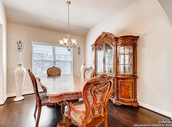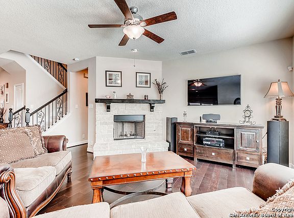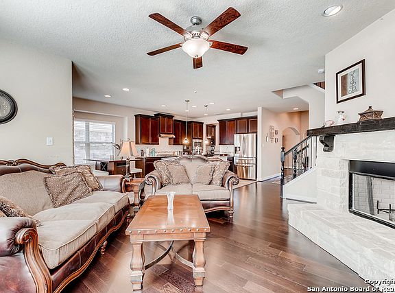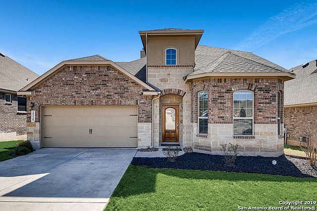 Exquisite 4BR, 2.5 BR home located at Tirana subdivision in Helotes. Open floor plan with living room, kitchen and dining area. Stone craft island w/ plenty of room for gatherings and cook space. Front office located on the main floor with decorative French-doors. Master suite and bath located downstairs w/ game room and 3 bedrooms upstairs for parental privacy. Home comes equipped w/ audio & home theater system upstairs & downstairs (pre-wired behind walls), and security monitoring system camera technology. Backs up to private green belt. Shows like new!