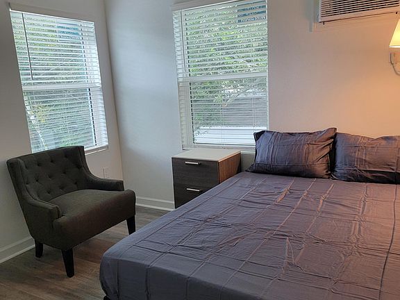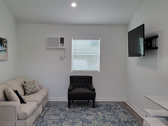 Mint 2 BR / 1 BA w spacious family room, high ceilings and laundry room (with washer & dryer). Almost new 2023 construction with air-tight impact windows. All waterproof faux-wood vinyl flooring, no carpeting! Ceiling fans and separate ACs in each bedroom and livingroom for greater energy efficiency. Furnished with queen beds, Havertys convertible sofa, armchair, 50" mounted TV, decorative rug, built-in eating bar (can double as work table) with stools. Can also be unfurnished if tenant prefers. Oversized 1-car garage optional for addl $100 monthly.