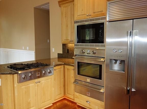 One level custom home with open interior design, vaulted ceilings, and hardwood floors. The kitchen features granite counter tops, stainless appliances, including wall mounted convection oven/ convection micro wave, + a warming oven gas cook top w/ griddle. Living room features a stone gas fireplace and access to deck. Master suite has gas fireplace & doors that open to 792 sq ft deck.