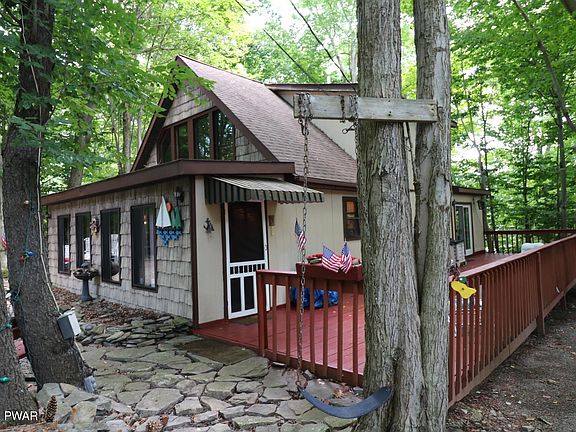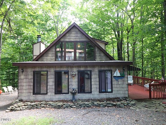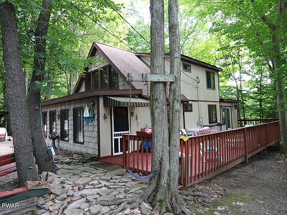 The mountain chalet home you have been looking for! Gently tucked away amongst the forest in the amenity rich community Wallenpaupack Lake Estates! 3 Bedrooms, 2 Bathrooms, walk in closet, ceiling fans in all the rooms, family room with jacuzzi tub, and a fire pit for roasting marshmallows. Close to the amenities, yet off the beaten path, you will enjoy walking distance access to the lakes, beaches, 3 pools, indoor pool, lap pool, and a pool with a water slide, gym, and the monstrous power boating lake, Lake Wallenpaupack! The community is also golf cart friendly!