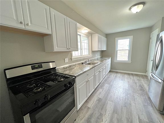 * Move Right In * This fully renovated home features a NEW ROOF/NEW WINDOWS/ NEW FLOORING/ VINYL SIDING AND MUCH MORE. Large Galley Kitchen with New Countertops & Includes appliances. Spacious living room filled with natural light. Easy first floor living with 1st floor bath and 2 bedrooms off the living area. 2nd Floor offers a 3rd potential bedroom and or make your master a captive room. Large concrete front porch to enjoy the morning sunshine. Full basement with Newer Furnace & Hwt, freshly painted and dry locked.