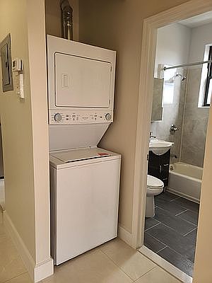 totally renovated 2 bedroom apartment. all the bells and whistles in this second floor ( top floor ) rear apartment. 2 equally sized bedrooms with closets and very bright. center living room with generous space. beautiful kitchen with separate dining area. beautiful tile / appliances and workmanship. beautiful washer and dryer inside your apartment. original wood floors underneath a completely modern and tastefull renovation. shops and transportation abound. no fee. pets ok. tenant pays and controls the heat and AC. one months rent and one month security deposit.
