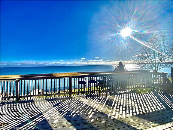 Gorgeous year round lake house with full walkout basement right on Lake Erie with beach. East of Peacock Point. Eagles, ducks, Canadian geese, fishing right off your back lot! Large primary bedroom on main floor ( room for second bedroom. )Sunroom all along one side with great views of lake. Bathroom on main floor features old fashioned soaker tub and stand up shower with vaulted ceiling. Vaulted ceilings throughout the rest of the main level and the water views are breathtaking! Living dining and kitchen are all open to each other. Natural gas fireplace on the main floor and also in lower family room. Two bedrooms down, laundry room, 2pc bath. Full walk out to cover patio and fully fenced rear yard. Big front porch. Circular driveway. Large beck deck looks out to Lake Erie. Fabulous sunrises and sunsets to the south. Full moon vies in the evenings. Appliances stay. A little piece of heaven. New privacy fence along east lot perimeter last year. Steel roof 2yrs ago. New central air. New flooring throughout main level. All draperies stay.