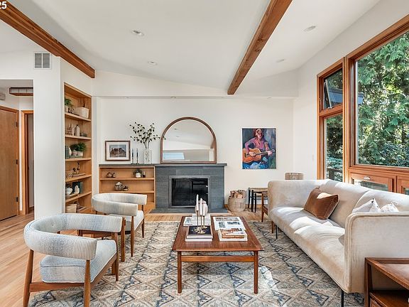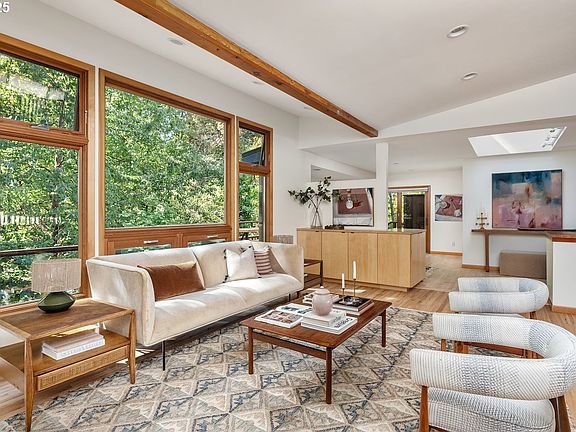 Introducing: The Treehouse Ranch in Hillsdale. Perched in the treetops above one of Southwest Portland’s most beloved neighborhoods, this 1960s ranch is the rare blend of nature, space, and convenience. Wrapped in greenery yet just steps from cafés, schools, shops, and trails, it feels like a private getaway in the city. Sunlight pours through oversized windows framing a canopy of evergreens, giving the open living room a serene, treehouse feel. Vaulted ceilings, exposed beams, and a cozy fireplace anchor the airy main level, where living, dining, and kitchen spaces flow easily together. The smart galley kitchen with skylights, dual sinks and generous storage makes everyday cooking a joy, while an oversized breakfast nook, with built-in seating and deck access, is perfect for coffee among the trees.With 4 bedrooms, 2.5 baths, an office and over 3,000 square feet, there is room for everyone and everything. The main-floor bedrooms include a peaceful retreat with deck access and stained-glass details, while the lower level offers two more bedrooms, a full bath, flexible bonus space, and a huge family room with gas fireplace. A large workshop and abundant storage add versatility.A two-level wraparound deck built for year-round entertaining and a tiered backyard surrounded by towering firs make outdoor living effortless. Recent updates include new roof and gutters, updated windows & sliding doors, eco-friendly flooring, Bosch appliances, induction cooktop and much more. Whether hosting a crowd, working from home, or watching the seasons change from your deck in the trees, The Treehouse Ranch is a rare chance to live among nature without leaving the city.