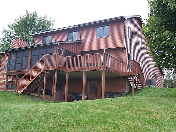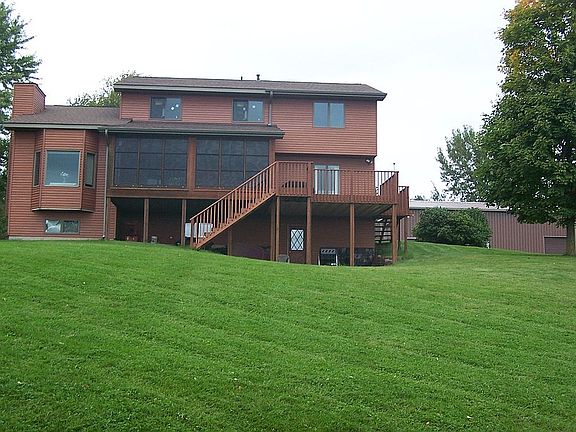 You will enjoy the gorgeous view from this beautiful 2 story home as you sit inside the 3 season porch or on the spacious outside deck. The first floor includes an office, laundry and sunken living room with a floor to ceiling gas fireplace. The sunken living room, loft and front entry have vaulted oak tongue and groove ceiling. The home includes a central vacuum system as an additional amenity. The second floor includes a large master bedroom with walk-in closet, adjoining bathroom w/ shower and Jacuzzi tub and a loft which overlooks the formal living room. The walkout basement is fully finished and it includes a bathroom w/ shower. With previously installed plumbing and wiring, a second kitchen is possible with endless opportunities for the space. The exterior includes a large yard, garden, and a storage shed to house all your toys.