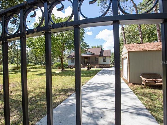 PRICE REDUCTION ON THIS NEWER HOME W/ACREAGE! This dream home sits on 1.39 fenced acres with multiple out buildings and its own private security gate. There is a workshop with a carport area, an open covered area, a storage shed and room for all your outdoor activities. This 2014 built home has 3BR/3BA's + BONUS ROOM , two of which are en suite and all are over sized. The kitchen has espresso cabinets, granite counters, stainless appliances and a stainless range hood. It is an open floor plan with an adjacent dining area and the great room with built in shelving. There are two guest bedrooms and guest bath on one side and the master and the additional en suite on the other along with a large laundry room. The master suite has a closet the size of a bedroom with its own window! The master bathroom was remodeled to include a magazine worthy shower/ tub enclosure combination along with the dual sinks, granite counters and private closeted toilet. The additional bonus room is en suite, currently a nursery and only lacks a door to use as an en suite bedroom. That bath also is accessible from the back porch and could be a pool bath if one were added. There is no carpet - all floors are laminate or tile for easy maintenance. Enjoy the cool evening breezes on the recently screened front porch. The new water conditioning system will stay with the home. The whole property is fenced including in ground wire mesh so your pets can't dig out! Let the seller's job relocation be your opportunity!