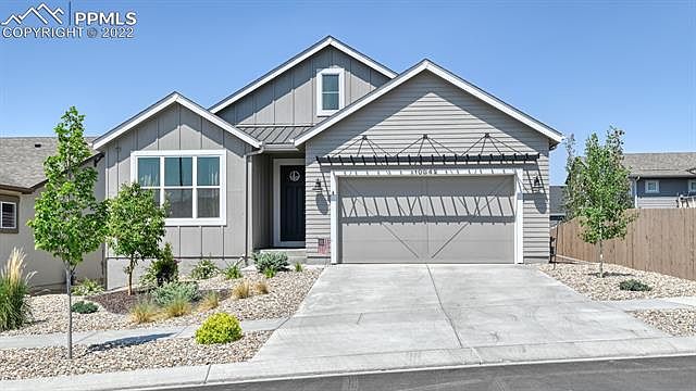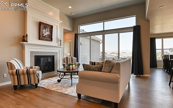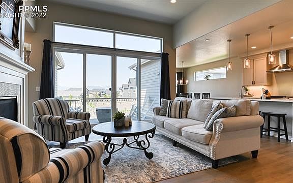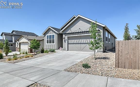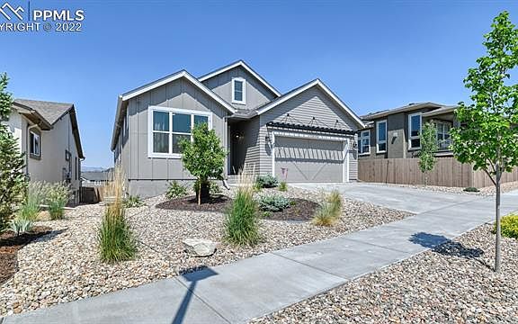 Welcome home! This stunning 4 bedroom 3 bath home combines classic farm elements with a modern edge. Created with sophistication and modern luxury in mind, this home design offers sprawling entertaining spaces and thoughtful, timeless details. The great rooms impressive 12-foot ceiling shares the spotlight with a dramatic floor-to-ceiling fireplace. The state-of-the-art kitchen is a chef's dream boasting 9-foot ceilings, a generous island, awesome coffee station and a walk-in pantry. A spacious everyday entry and separate laundry room for your for comfort and convenience. The main-level flex room and bedrooms feature 9-foot ceilings, including the private primary bedroom suite with a luxurious attached bathroom. Entertaining will be a breeze with the double sliding glass doors out to a great patio with unobstructed views of Pikes Peak! The lower level has an expansive recreation room with 9' ceilings and a built in bar that will be perfect for time spent with family and friends. The yard has been beautifully landscaped and provides extra patio space to enjoy the summer evenings! A three-car tandem garage provides ample space for vehicles and toys. Miles of neighborhood walking trails, parks, along with a beautiful community center with a seasonal pool and tons of fun summertime activities for the Cordera community! Don't miss this one! It won't last long! Make this gorgeous home yours!