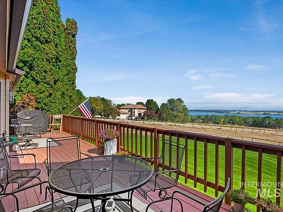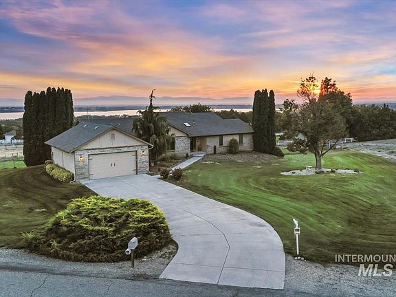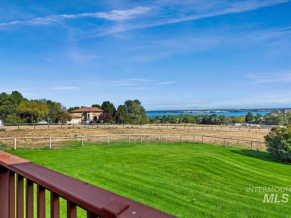 Amazing unobstructed views of Lake Lowell and the Treasure Valley providing a picturesque and tranquil setting. This beauty sits on 2.2 acres, boasting 6 bedrooms and 3.5 bathrooms, perfectly suitable for a large family or for hosting guests. The 2 sided wood-burning fireplace in the large living space adds a cozy and inviting atmosphere. Bay windows in the kitchen and dining area, providing a lot of natural light creating a bright and pleasant living space. 800 sqft of conditioned unfinished space provides flexibility for future customization, including adding more bedrooms, creating a bonus room, gym, game room or theatre. Open daylight basement that could double as an Airbnb or rental. New LVP floors in all 3 secondary bathrooms. For the equestrian lover, the property is well-equipped including a fully fenced pasture, pole barn, tack room, running water, and electricity. Well-maintained and versatile property that offers a mix of natural beauty, functional spaces, and future potential.