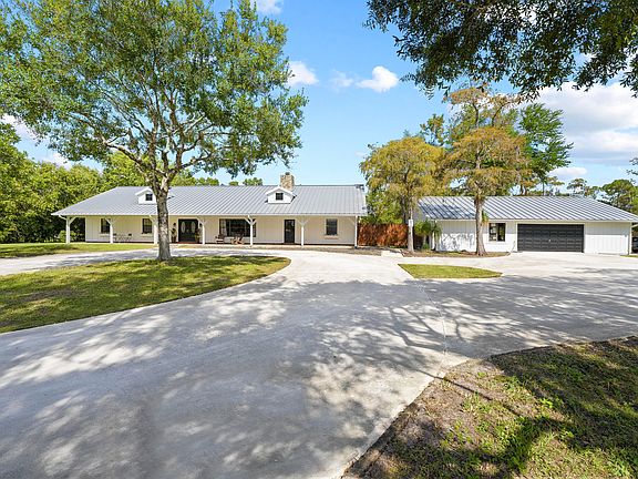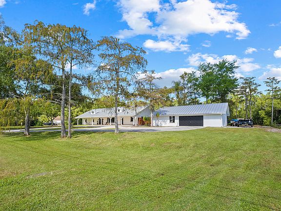 Welcome to your private country retreat, a rustic and charming ranch-style home with an attached in-law suite and a 3 car detached garage nestled on 2.5 acres of serene beauty. This 3,375 square foot, 4-bedroom, 3-bathroom sanctuary offers the perfect blend of modern comfort and natural allure.As you approach, you'll be captivated by the tranquil surroundings and the fully stocked pond that graces the property, providing a picturesque backdrop to your new home. The metal roof, installed in 2010, ensures both durability and timeless appeal, while the freshly painted exterior welcomes you with a touch of modern elegance.Step inside, and you'll be greeted by beautiful vaulted cedar ceilings that create an inviting and warm atmosphere. The large stone wood-burning fireplace in the heart of the home adds a touch of classic charm. The huge, spacious open living room and kitchen area, with a large Florida room featuring exquisite pecky cypress, offer endless possibilities for gatherings, entertaining, and enjoying quality family time.