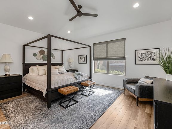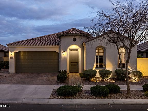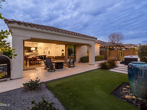 This stunning home in the highly sought-after Eastmark community offers modern upgrades and a prime location right across from the park. Enjoy fantastic curb appeal with low-maintenance landscaping before stepping inside to find neutral paint, elegant sconces, and LVP flooring throughout. The gourmet kitchen is a showstopper, featuring black shaker cabinets, under-cabinet lighting, a reverse osmosis system, upgraded pendant lights, a single-basin sink, a stylish tiled backsplash, stainless steel appliances, additional canned lighting, and a massive island that seamlessly connects to the dining and living spaces. The dining area is bathed in natural light from the expansive sliding wall and showcases upgraded lighting and framed mirrors that convey. The main living space impresses with soaring vaulted ceilings, surround sound throughout the entire home, and an upgraded ceiling fan. The primary suite is an inviting retreat with vaulted ceilings, dual sinks with extra cabinet space, a massive walk-in shower, and a spacious walk-in closets. The half bath adds a designer touch with an upgraded vanity and a marble tile accent wall. Additional upgrades include a water softener, overhead storage, built-in cabinets, a utility sink, and an epoxied garage floor. Plus, the water heater was replaced in 2024. Step outside to a dream backyard featuring an above-ground spa, a tranquil water feature, misters, landscape lighting, and artificial turf for easy maintenance. Living in Eastmark means access to resort-style amenities, including luxurious pools, splash pads, abundant parks, Steadfast Farm, and the state-of-the-art clubhouse, "The Mark," which hosts year-round events and activities. Don't miss your chance to make this extraordinary home yours!