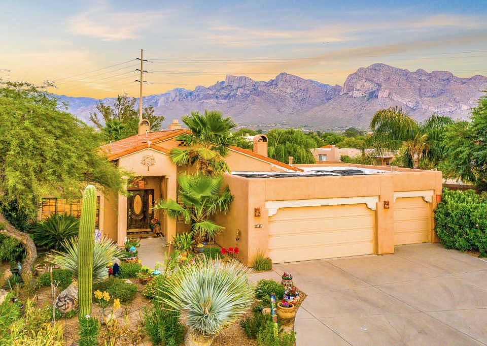 We are proud to present this unique home in the gated community, The Villages of La Canada in Oro Valley. 4 Bedrooms (2 owner's suite's), 3 Bathrooms, Extended 3 Car Garage, 2,927 SF, .40 acre lot with Pool & Mountain Views. Lots of living space with lots of privacy. As you drive up this extended driveway, you'll feel the pride in ownership. There's nothing like this ''one of a kind'' custom builder home. Updated kitchen with granite counter tops, gas cook-top, & modern cabinets. The great room has over sized windows to take advantage of incredible mountain views & door to take you to your backyard oasis. Freshwater pool, built-in BBQ, lawn for kids to play & mountain views. 51 Owned Solar Panels, 3 Gas Fireplaces, Central Vacuum system, 660 gal storage water tank & room for RV parking.