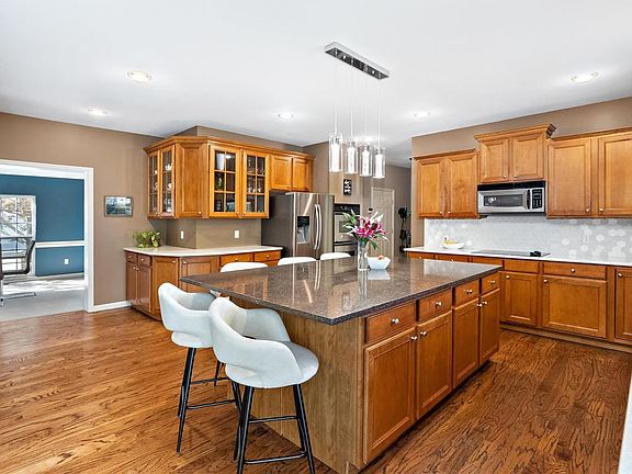 Fantastic home with HUGE room sizes and plenty of room to spread out! Located in super convenient and highly sought after Brook Hollow, this home is sure to please the moment you enter the door. Bright and sunny office space and large dining room flank the entry. Then step back to a family room with fireplace. The kitchen space is UNBELIEVEABLE! New refinished hardwood floors, solid surface countertops, tile backsplash and more counterspace than you could ever fill! PLUS a huge island! This kitchen accommodates ALL the cooks with plenty of elbow room. Even the laundry room is super sized here! Upper level hosts 3 BIG bedrooms all with walkin closets in addition to the ginormous master suite and a huge common loft area for family gathering. Finished lower level walkout hosts a rec room with stacked stone FP and wet bar, full bath, bonus room for exercise or office. Shady backyard with maintenance free deck and patio is fenced for kids/pets. A rare find with this much space!