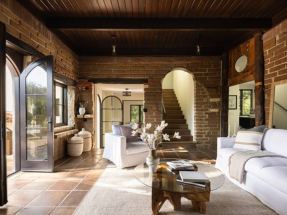 Folding steel-framed glass doors extend the kitchen to a sunlit patio for seamless indoor/outdoor living. The living room - once an historic adobe cottage - retains its authenticity with 14-inch adobe walls, satillo tile floors, rustic beams, and a stone fireplace.
