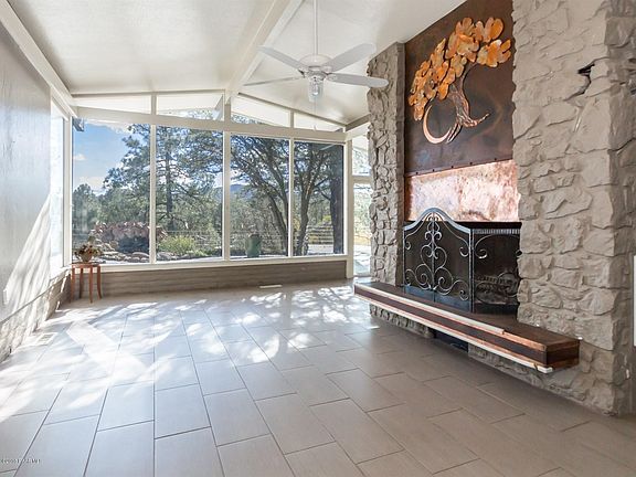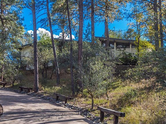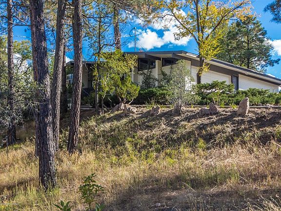 Mid-Century Modern home located on a small private knoll, just 1.4 miles to Historic downtown Prescott. Floor to ceiling windows provide views of the tall ponderosa pines and panoramic views of the area. Massive fireplace anchors the large and open house that is perfect for large gatherings or cozy evening. Formal dining room, separate living and family rooms, open kitchen, and large master suite. Walk out basement is perfect for game room, or additional living area. Huge outdoor patio area provides amazing out door living, dining, entertaining, with privacy for enjoying all Prescott has to offer.Hot tub is tucked in close to the house and the green house is ready to help bring all your gardening dreams come true.