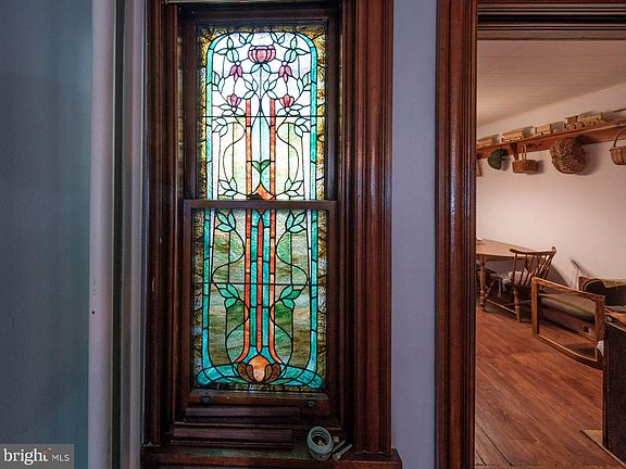 Very Large Row home, beautiful hardwood floors and natural woodwork. Custom stain glass windows done by a local craftsman, updated kitchen, new gas heater and water heater, pocket doors ,updated electric panel box, half bath first floor, Large two story shed in back yard, Front porch, 4 ceiling fans ,2 stairs cases to second floor, some replacement windows and so much more. Owner has lived here for the past 40 years .